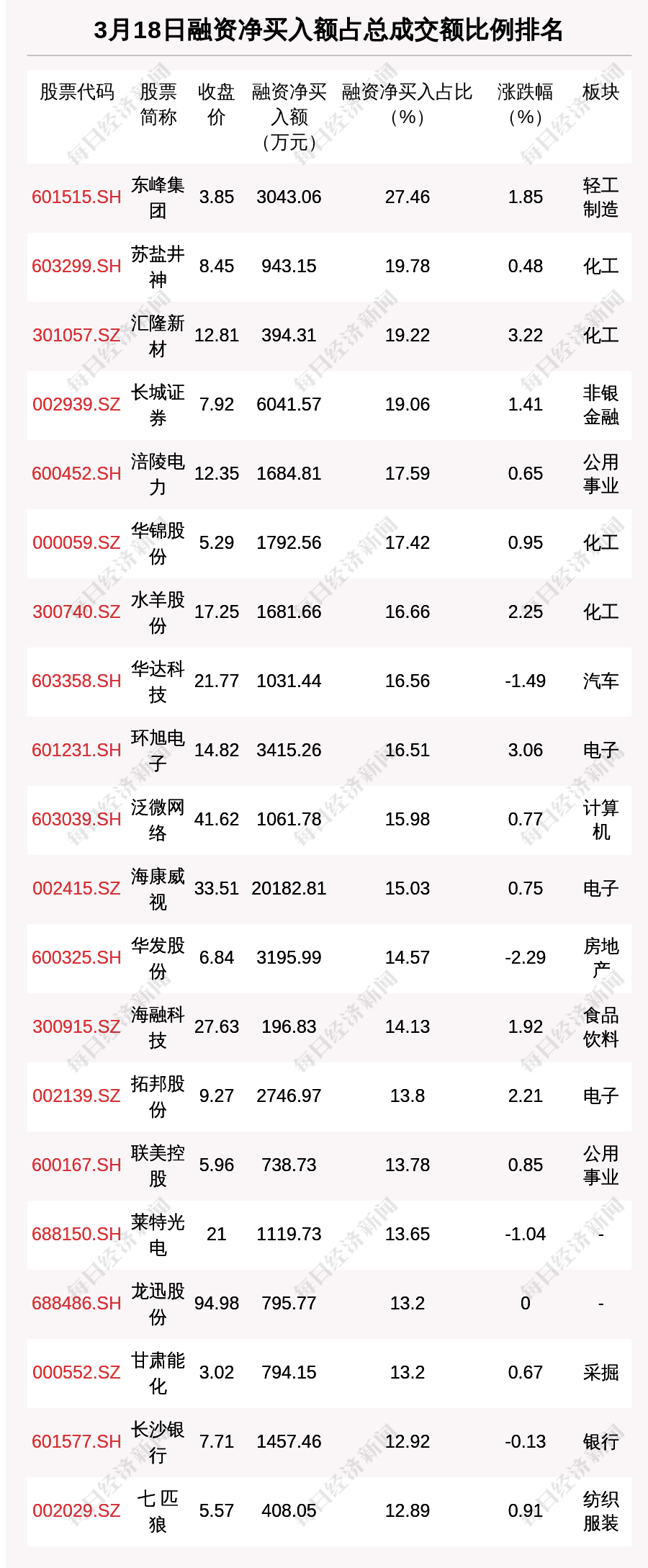 3月18日兩市共有1918只個股有融資資金凈買入。共有67只股票融資凈買入額占總成交金額比例超10%,其中東峰集團、蘇鹽井神、匯隆新材排名前三,占比分別為27.46%、19.78%、19.22%。