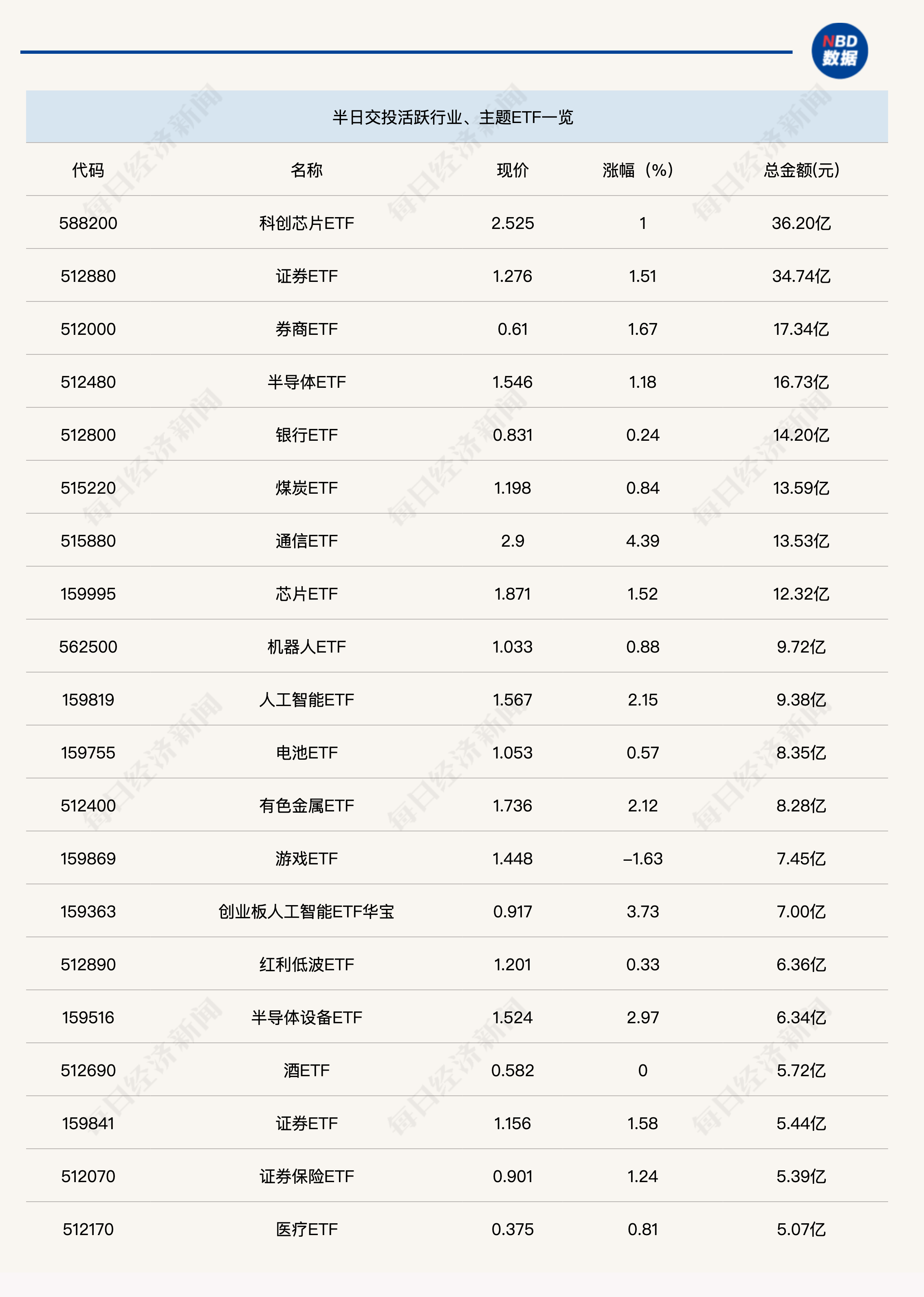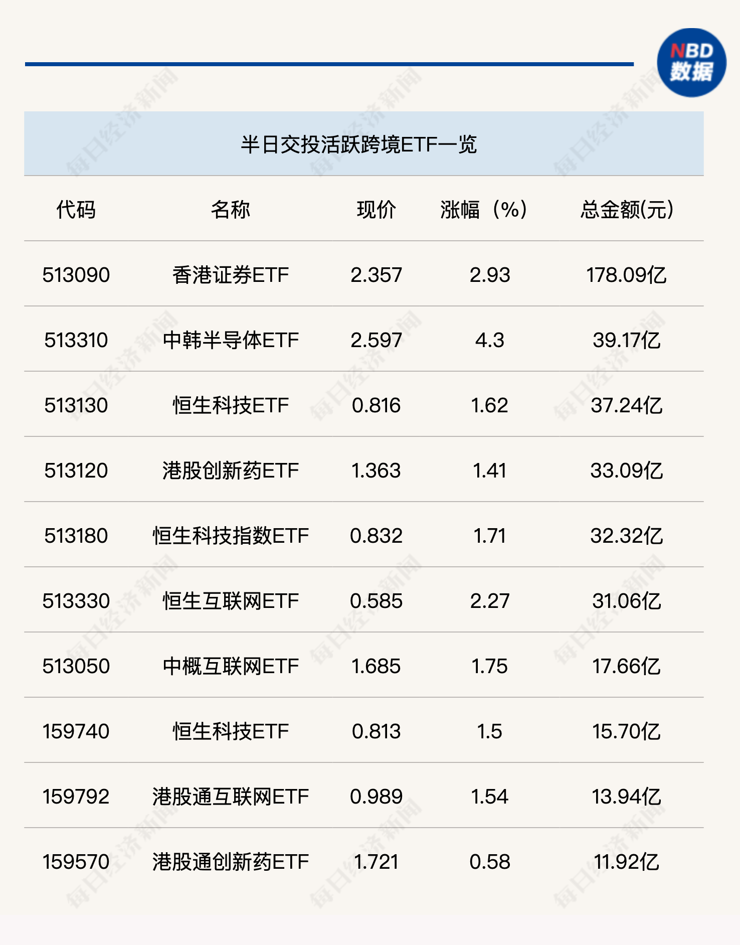 今日上午,ETF成交量明顯放大,證券ETF交投極其活躍。其中,香港證券ETF(513090)半日成交金額達(dá)到178億元;證券ETF(512880)和券商ETF(512000)半日合計(jì)成交額也超過(guò)50億元。