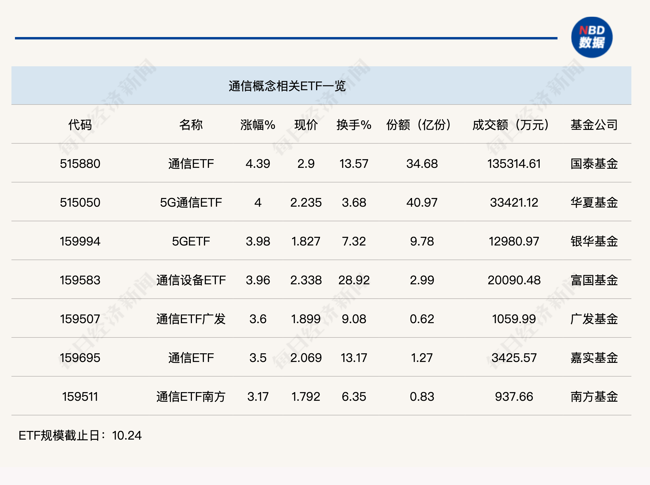 ETF漲幅榜上,通信ETF(515880)半日漲幅達(dá)到4.39%,居ETF半日漲幅榜之首;此外,與通信相關(guān)的5G通信ETF(515050)和5GETF(159994)半日漲幅也在4%左右。
