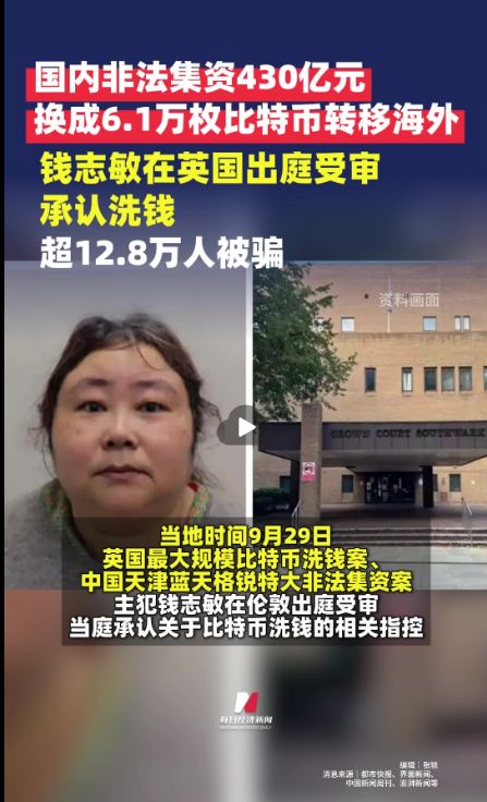 據(jù)都市快報,當?shù)貢r間9月29日,英國最大規(guī)模比特幣洗錢案、中國天津藍天格銳特大非法集資案主犯錢志敏在倫敦出庭受審,當庭承認關于比特幣洗錢的相關指控。該案中有超過12.8萬人被騙,涉及6.1萬枚比特幣(約合人民幣493.5億元),她承認獲取并持有這些非法所得。