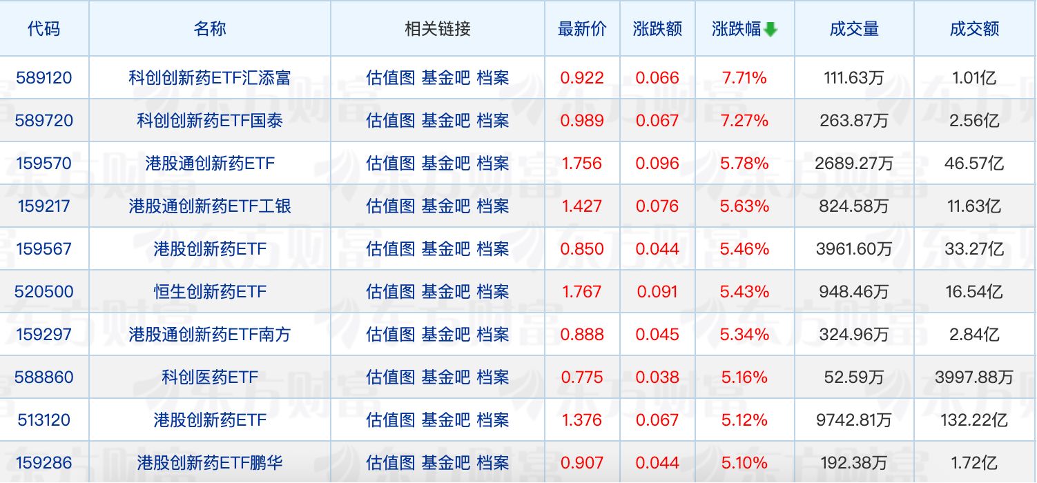 具體來看,創(chuàng)新藥相關(guān)ETF集體走強(qiáng),科創(chuàng)創(chuàng)新藥ETF匯添富、科創(chuàng)創(chuàng)新藥ETF國泰漲超7%。