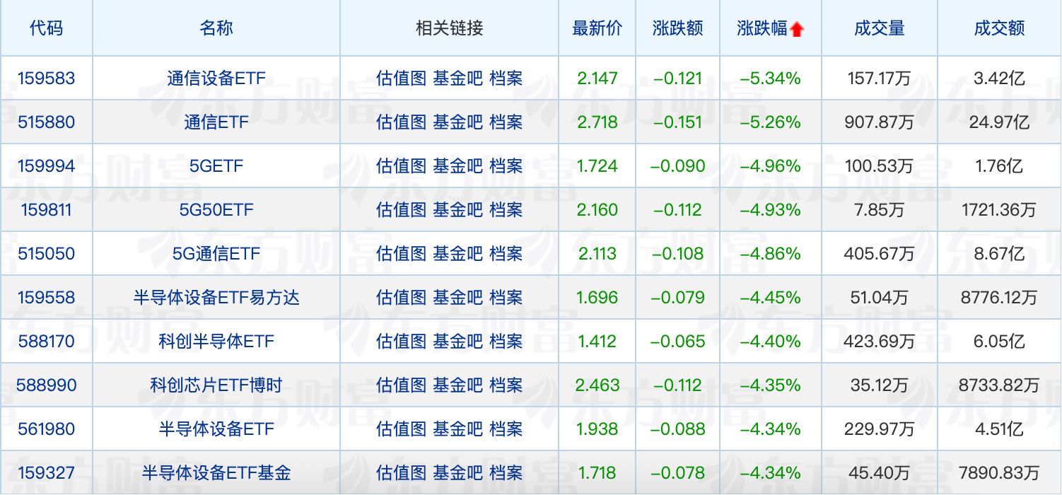 下跌方面,算力硬件概念股集體下跌,“易中天”光模塊三巨頭大幅調(diào)整。通信相關(guān)ETF回調(diào)居前,最大跌幅為5.34%。