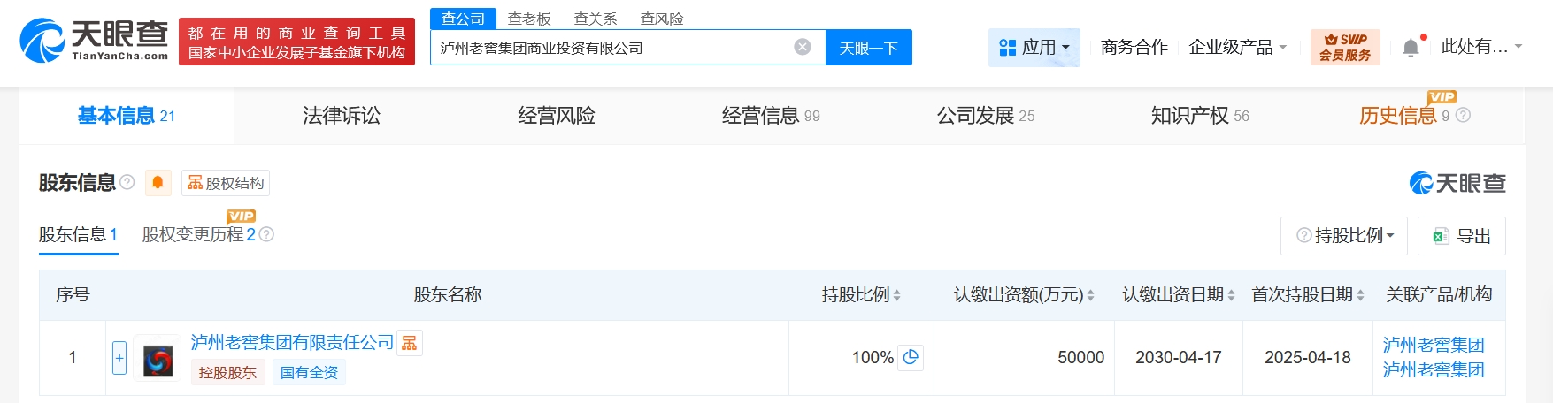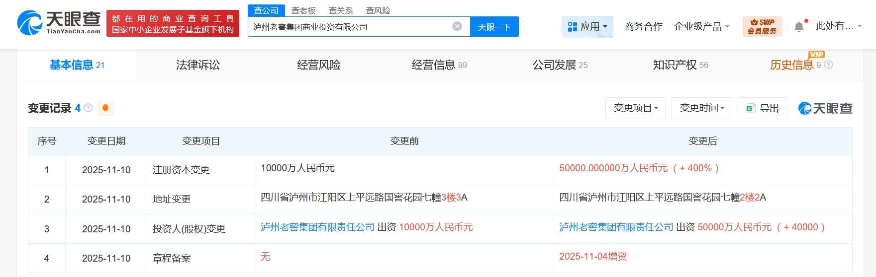 每經(jīng)AI快訊,天眼查工商信息顯示,近日,瀘州老窖集團(tuán)商業(yè)投資有限公司發(fā)生工商變更,注冊(cè)資本由1億元人民幣增至5億元人民幣,增幅400%。該公司成立于2025年4月,法定代表人為朱勇,經(jīng)營(yíng)范圍為房地產(chǎn)開發(fā)經(jīng)營(yíng)、建設(shè)工程施工、酒類經(jīng)營(yíng)、以自有資金從事投資活動(dòng)、園區(qū)管理服務(wù)、非居住房地產(chǎn)租賃、住房租賃、商務(wù)代理代辦服務(wù)等。股東信息顯示,該公司由瀘州老窖集團(tuán)有限責(zé)任公司全資持股。值得一提的是,近期,瀘州老窖資本控股有限責(zé)任公司也發(fā)生工商變更,注冊(cè)資本由約15.3億元人民幣增至約20.3億元人民幣,增幅約33%,