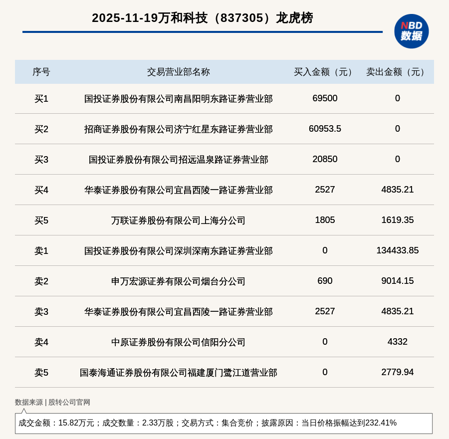 每經(jīng)訊,2025年11月19日,新三板創(chuàng)新層公司萬和科技(837305,收盤價:6.95元)登上龍虎榜,交易方式是集合競價,披露原因是當日價格振幅達到232.41%,成交數(shù)量2.33萬股,成交金額15.82萬元。買一席位為國投證券股份有限公司南昌陽明東路證券營業(yè)部,買入6.95萬元;賣一席位為國投證券股份有限公司深圳深南東路證券營業(yè)部,賣出13.44萬元。
