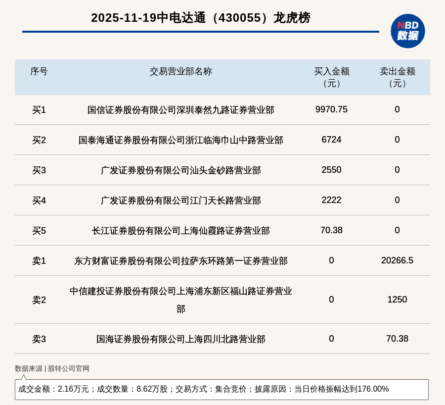 每經(jīng)訊,2025年11月19日,新三板基礎(chǔ)層公司中電達(dá)通(430055,收盤價(jià):0.69元)登上龍虎榜,交易方式是集合競(jìng)價(jià),披露原因是當(dāng)日價(jià)格振幅達(dá)到176.00%,成交數(shù)量8.62萬股,成交金額2.16萬元。買一席位為國信證券股份有限公司深圳泰然九路證券營業(yè)部,買入9970.75元;賣一席位為東方財(cái)富證券股份有限公司拉薩東環(huán)路第一證券營業(yè)部,賣出2.03萬元。