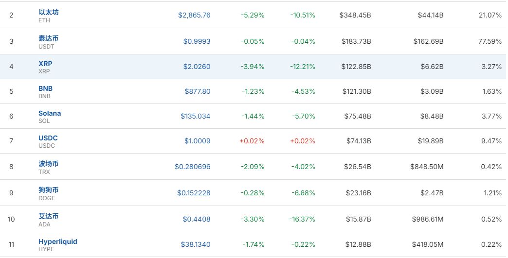 以太坊跌超5%,艾達(dá)幣跌超3%。