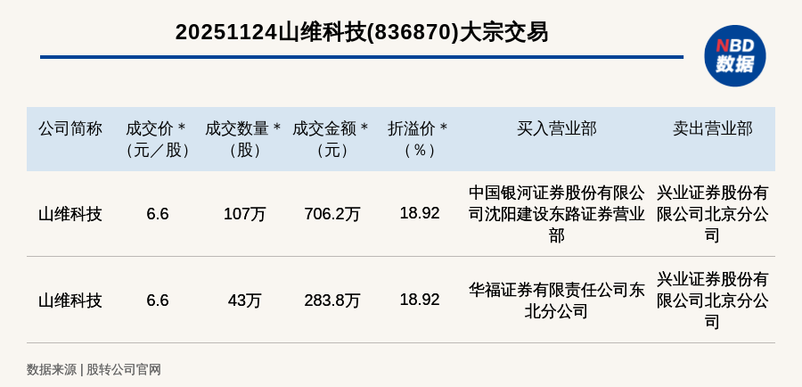 每經(jīng)訊,2025年11月24日,新三板創(chuàng)新層公司山維科技(836870,收盤價:5.55元)發(fā)生2筆大宗交易,總成交金額為990萬元,成交金額最高的一筆成交價6.6元/股,成交數(shù)量107萬股,成交金額706.2萬元,溢價18.92%。買入營業(yè)部是中國銀河證券股份有限公司沈陽建設(shè)東路證券營業(yè)部,賣出營業(yè)部是興業(yè)證券股份有限公司北京分公司。
