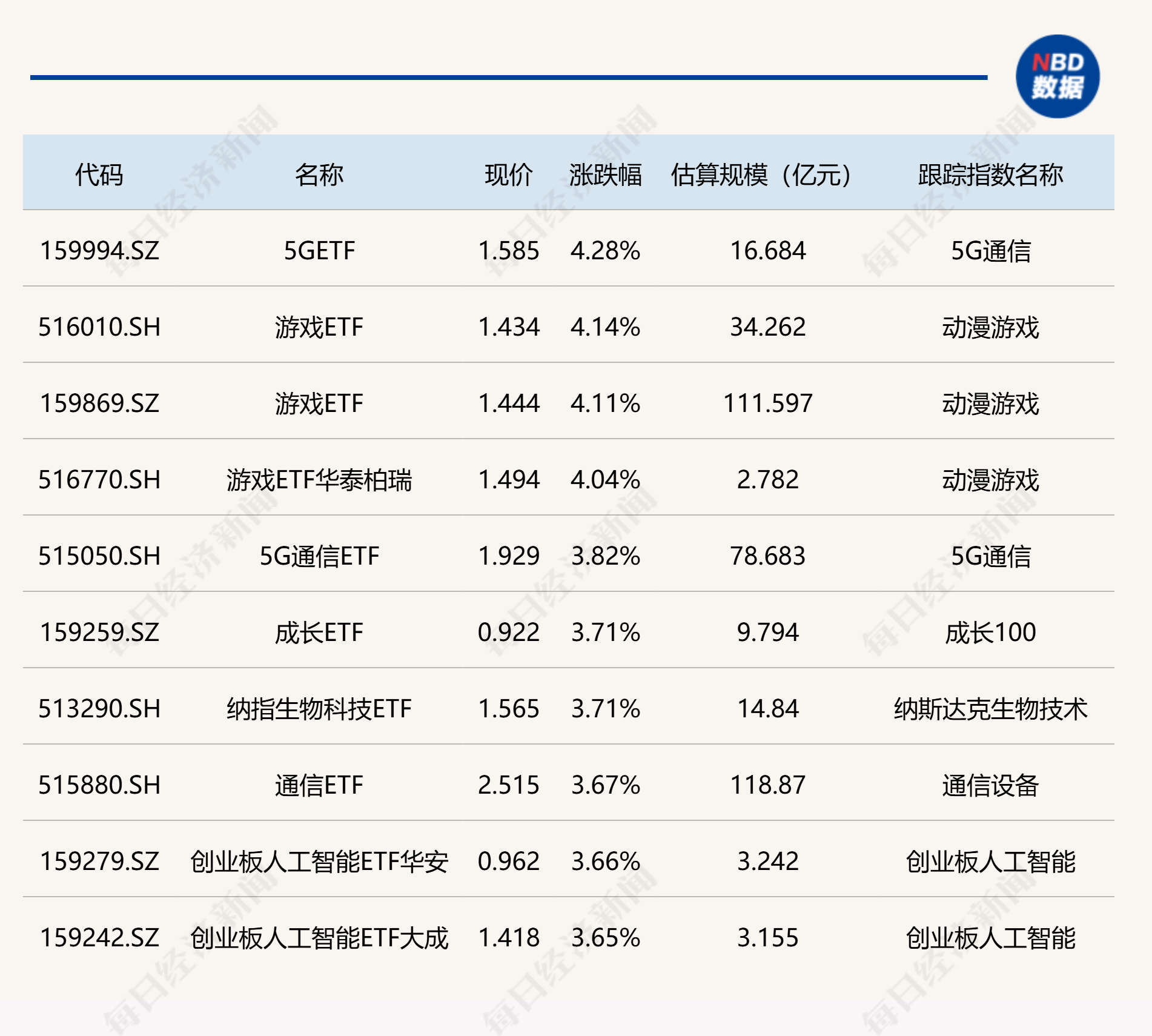 ETF漲跌幅方面,5G、游戲相關(guān)ETF漲超4%。