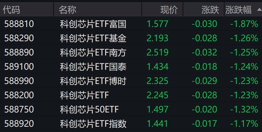 受盤面影響,科創(chuàng)芯片相關(guān)ETF跌超1%。