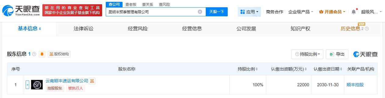 每經(jīng)AI快訊,天眼查App顯示,近日,昆明豐預(yù)泰管理有限公司成立,法定代表人為聶衛(wèi)林,注冊(cè)資本2.2億元人民幣,經(jīng)營(yíng)范圍包括園區(qū)管理服務(wù)、企業(yè)管理咨詢、物業(yè)管理、信息咨詢服務(wù)等。股東信息顯示,該公司由云南順豐速運(yùn)有限公司全資持股。