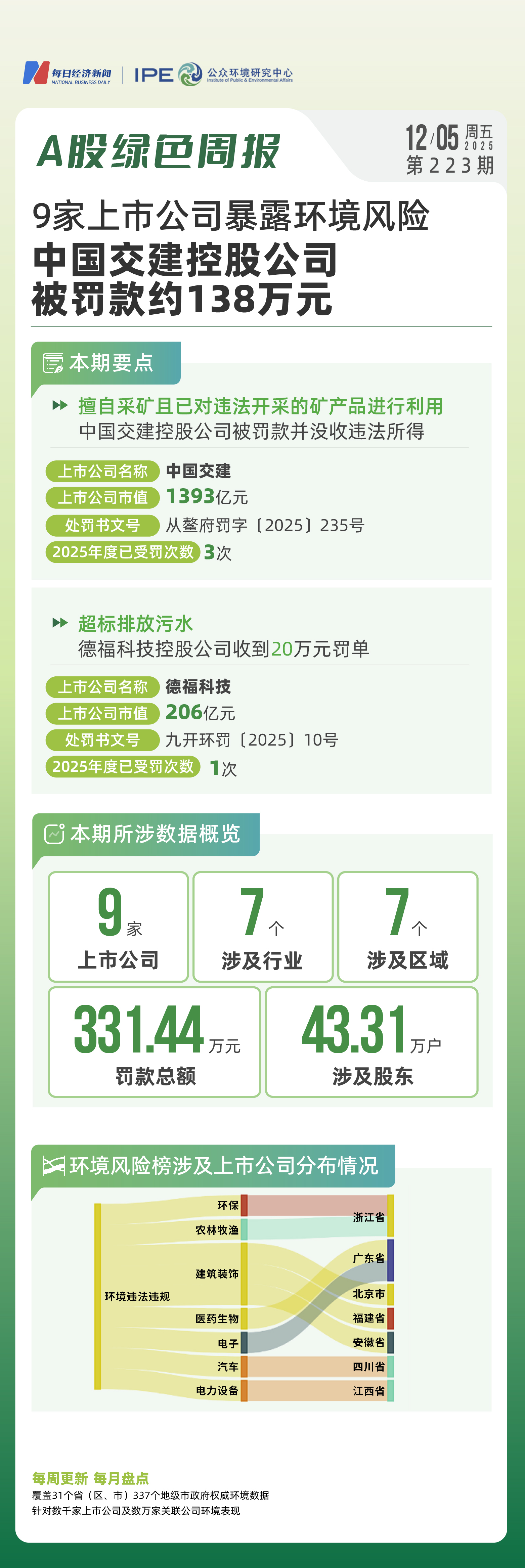 《每日經(jīng)濟新聞》聯(lián)合公眾環(huán)境研究中心自2020年9月起每周發(fā)布“A股綠色周報”。2025年12月第一周數(shù)據(jù)顯示,9家上市公司暴露環(huán)境風(fēng)險,涉及43.31萬戶股東。其中,中國交建控股公司因無證采礦被罰138.4萬元并沒收違法所得346萬元;德??萍伎毓晒疽虺瑯?biāo)排污被罰20萬元;豪能股份控股公司排污違規(guī)被罰27萬元。