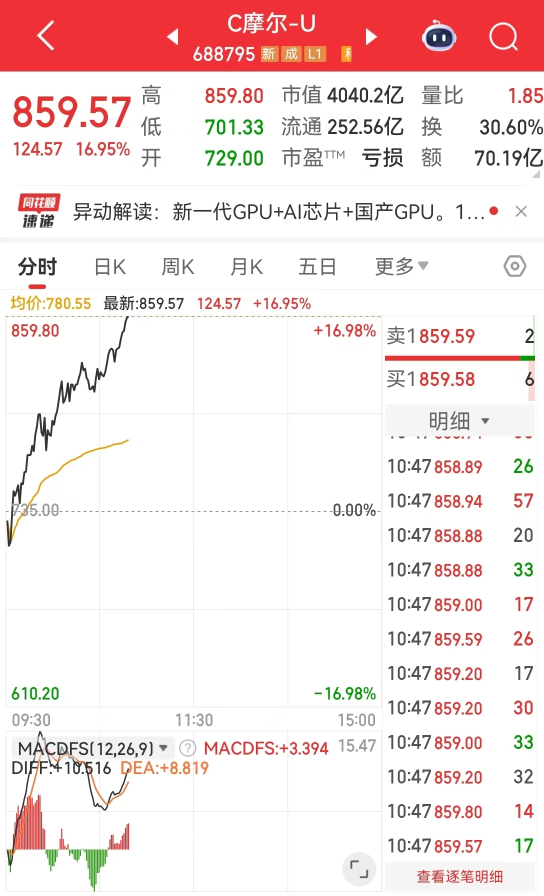 12月11日,“國(guó)產(chǎn)GPU第一股”摩爾線程(SH688795)股價(jià)快速拉升,截至發(fā)稿,摩爾線程漲近17%,報(bào)859.57元,總市值達(dá)4040.2億元。