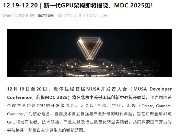 據(jù)摩爾線程官微消息,12月19日至20日,摩爾線程首屆MUSA開發(fā)者大會(huì)將在北京中關(guān)村國(guó)際創(chuàng)新中心拉開帷幕。