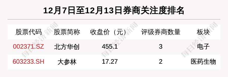 從券商對個股的關(guān)注程度來看,有2只個股獲得多家券商關(guān)注,券商關(guān)注數(shù)量排名居前的個股是北方華創(chuàng)(002371.SZ)、大參林(603233.SH)。