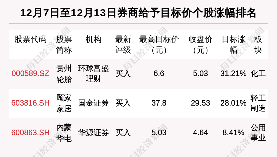 每經(jīng)AI快訊,12月7日至12月13日,券商給予評級的個股數(shù)共有66只,獲得“買入”評級的個股數(shù)共有38只。在公布了目標(biāo)價格的4只個股中,按照最新收盤價計算,預(yù)期漲幅排名居前的個股是貴州輪胎(000589.SZ)、顧家家居(603816.SH)、內(nèi)蒙華電(600863.SH),預(yù)期漲幅分別是31.21%、28.01%和8.41%。