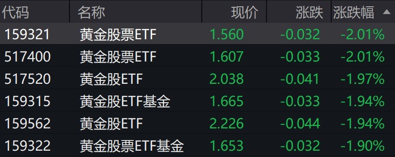 受盤面影響,黃金股相關(guān)ETF跌約2%。